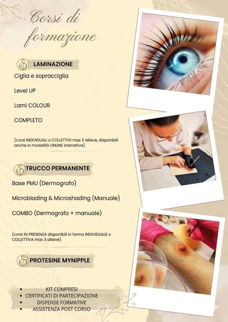 La mia passione per la dermopigmentazione si estende anche alla formazione. Sono coach certificata e collaboro con accademie e studi estetici, organizzando corsi personalizzati no brand di trucco permanente e laminazione ciglia.